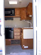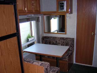 kitchen, bedroom in distance, pushed-out sofa on left, dinette on right